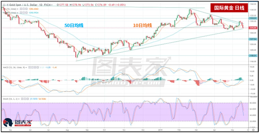 若价格继续下行,短期支撑位见趋势线支撑位1273附近,进一步支撑见整数关口1270.00.